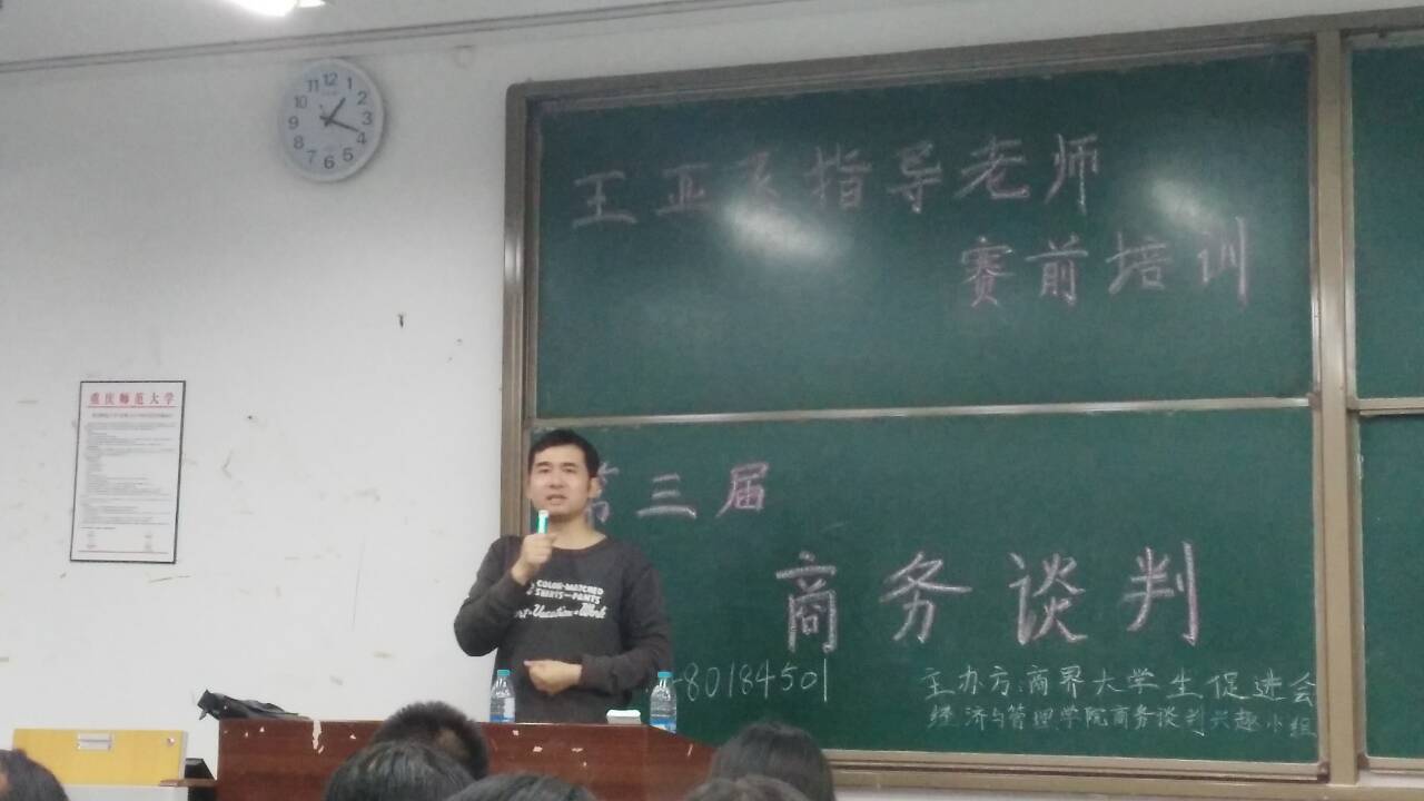 据了解,王亚飞老师曾带领商务谈判队获得2014年11 月 22 日 -23日在北京交通大学举办的“北京交大杯”2014未来国际商务谈判精英大赛二等奖。本次大赛参赛者众多,各学院同学踊跃报名参加,其中更有院级以及校级辩论队参赛,使得此次比赛竞争激烈。会上,王亚飞老师围绕商务谈判赛前准备,赛中发挥以及赛后总结三个要点展开详细介绍,他告诉参赛选手们,尽管只是模拟谈判,但谈判中所运用的知识确实扎扎实实的,这就需要选手们多看多记,积累专业的经济学知识,赛前要做好预案,赛时要能随机应变,赛后总结要到位。选手们就王亚飞老师讲说中不理解得地方提出问题,王老师都一一耐心解答,他的回答生动有趣,妙趣横生,整堂大会气氛活跃。活动的最后,王亚飞老师告诉选手们应该多看看网上的商务谈判案例,做好赛前工作,走稳第一步,并祝愿每位选手能取得优秀成绩。