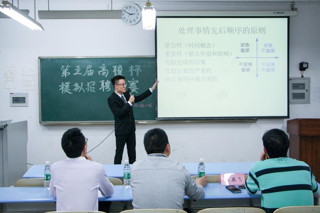 5月19日下午,为培养学生的应聘能力,感受招聘氛围,经济与管理学院第五届“高顿杯”模拟招聘大赛于弘德楼13101教室顺利举行。大赛在模拟招聘兴趣小组指导老师吴博的指导下由社会实践协会、模拟招聘兴趣小组主办。高顿财经公司代表张宇、我院党委副书记任源钢以及副教授王亚飞受邀担任本次大赛的评委。